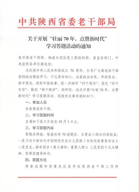 为庆祝中华人民共和国成立70周年,引导广大离退休干部坚持政治理论学习,不忘革命初心,永葆政治本色,学好党史、新中国史,讲好中国故事,进一步树牢“四个意识”,坚定“四个自信”,做到“两个维护”,经研究,决定开展“壮丽70年,点赞新时代”学习答题活动。