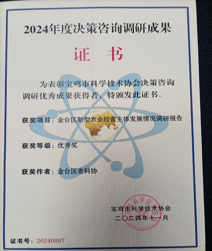 近日,金台区老科协在宝鸡市科协2024年度决策咨询调研成果奖及宝鸡市老科协金秋论文奖的评选中喜获佳绩,其中1篇调研报告荣获决策咨询调研成果奖,3篇荣获金秋论文奖。这些荣誉的获得,不仅彰显了金台区老科协在决策咨询和服务科技创新方面的深厚实力,也进一步激发了其服务地方经济社会发展的热情和动力。