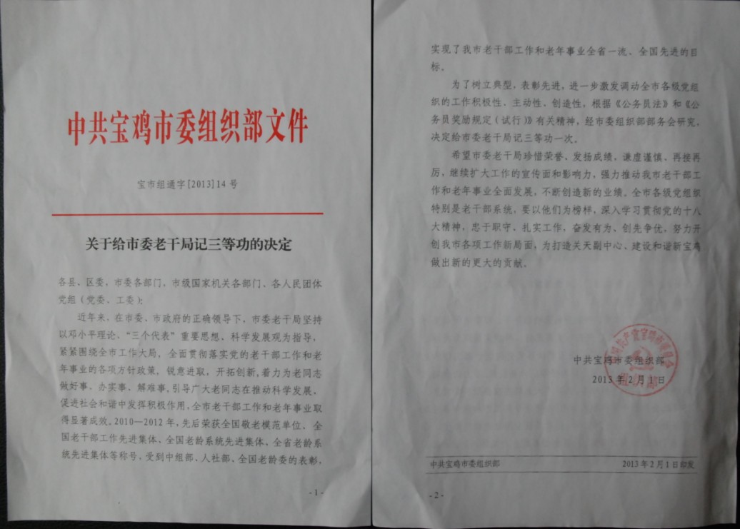 近日,宝鸡市委组织部决定,给宝鸡市委老干部工作局记三等功一次。这是宝鸡市委市政府对近年来市委老干部工作局和市老年事业局开拓创新、锐意进取,积极推动全市老干部工作和老年事业科学发展所付出的不懈努力和取得的成绩给予的高度肯定,也是对市委老干局和市老年事业局一班人寄予鼓励和期望,充分体现了宝鸡市委市政府对老干部工作和老年事业的关心、重视和支持。