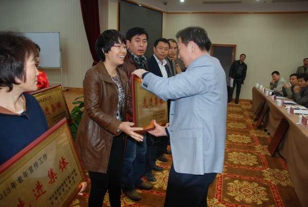 杨建成局长为2013年老年宣传工作先进集体颁发奖牌