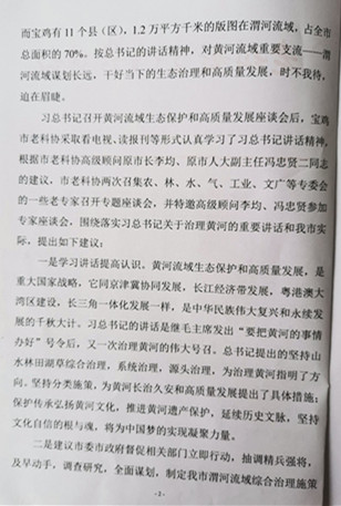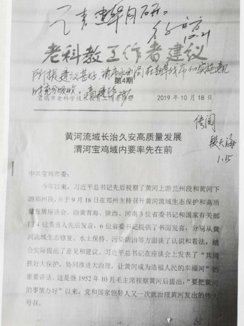 宝鸡市老科协认真学习了习近平总书记的重要讲话,市老科协高级顾问、原宝鸡市长李均,市老科协高级顾问、原市人大常委会副主任冯忠贤以高度的政治责任感充分发挥高级顾问作用,向会长倪宝生同志建议市老科协在治理黄河这件事情上要发挥好决策咨询作用,向市委市政府提出黄河最大的支流渭河流域综合治理的决策建议。市老科协专题研究,由副会长常崇信负责召集相关专委会负责人及老专家、老技术人员的调研座谈会,两位高级顾问参加,研究提出了《黄河流域长治久安高质量发展,渭河宝鸡域内要率先在前》的老科协工作建议。这个建议报市委后,副省长、宝鸡市委书记徐启方阅后批转分管副市长高建华同志阅研,高建华副市长也明确批示:所提建议甚好,请市水利局在起草我市实施意见时充分吸收。