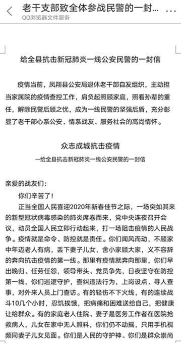 二是发挥作用,争当坚强后盾。疫情发生后,全体公安民警义不容辞奔向抗战一线,加班加点,顾不上照顾家庭,凤翔县公安局退休老干支部自发组织,担起重任。他们上门走访,看好门,守好家,主动承担家属院的疫情防控工作,肩负起照顾家庭,照看孙辈的重任,解除一线民警的后顾之忧,成为一线民警的坚强后盾。同时,他们还给全县抗击新冠肺炎一线公安民警发出一封感谢信---《众志成城抗击疫情》,充分彰显了老党员心系公安、情系战友、服务社会的高尚情怀。
