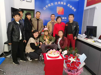 在老人生日当天,区老干部工作局联系社区同志,为老人购买了生日蛋糕和礼物,一起为她送上生日的祝福。手捧鲜花的林玉花笑意盈盈地告诉大家:“感谢共产党给了我幸福的生活,我可高兴了”。