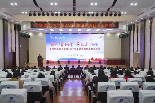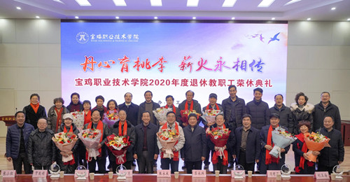 1月6日下午,宝鸡职业技术学院举行2020年度教职工荣休典礼,为2020年度荣休的23名教职工颁发证书,感谢他们为学院教育教学事业做出的贡献,荣休的老同志用肺腑之言感谢学院成就他们人生的高光时刻。退休教职工代表,学院党委书记苏永兴,院长张永良及学院相关领导和部门负责人、青年教师代表、学生代表参加典礼。