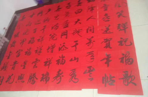 ……一副副散发着清新墨香的春联展现在人们眼前:大红的春联铺在地上,既有辞旧迎新、展望未来的美好愿景,又有脱贫致富、奔向小康的幸福目标,更有歌颂党恩、永跟党走的深情厚谊、铿锵誓言。