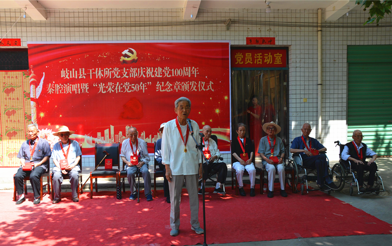 县干休所老干支部委员、退休干部祁明轩代表9名老党员发言。他感谢党的关怀,表示能够在建党100周年时获得“光荣在党50年”纪念章,既光荣又自豪,会加倍珍惜荣誉,坚定地听党话、跟党走,永葆革命本色,一如既往地发挥正能量,为岐山的发展建言献策,把好的传统、好的思想和好的作风传承给下一代。