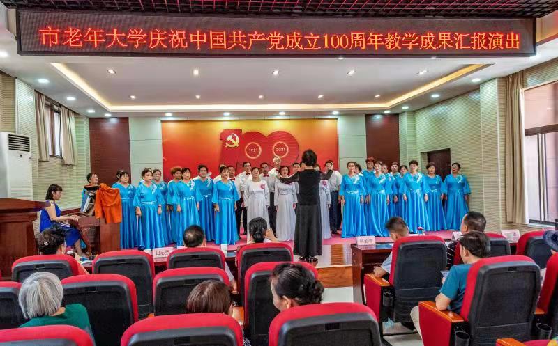 7月8日上午,市老年大学一楼大厅翰墨飘香、丹青吐艳,演播厅内歌声嘹亮、舞姿优美。由市老年大学举办的庆祝中国共产党成立100周年教学成果汇报演出暨习作展示在这里隆重举行。全校教职员工200余人参加观演。
