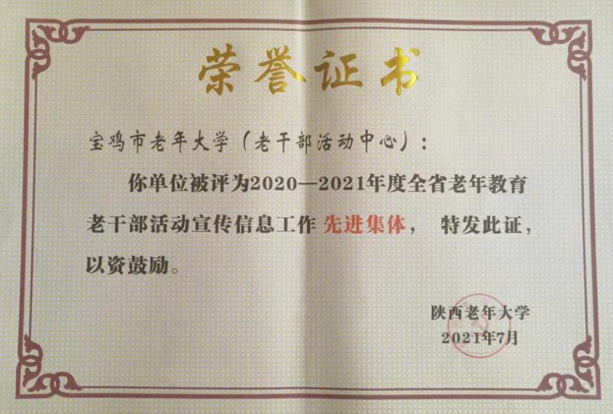 市委老干局荣获全省“颂光辉历程、赞辉煌成就、助追赶超越”主题征文、“永远跟党走 奋斗新时代”主题文艺演出、书画摄影歌舞征文作品网络展示评选活动“优秀组织奖”。市老干部活动中心(市老年大写)被省老年大学评为2021-2024年度“全省示范老干部活动中心”、主题征文优秀组织单位以及2020-2021宣传信息工作先进集体。