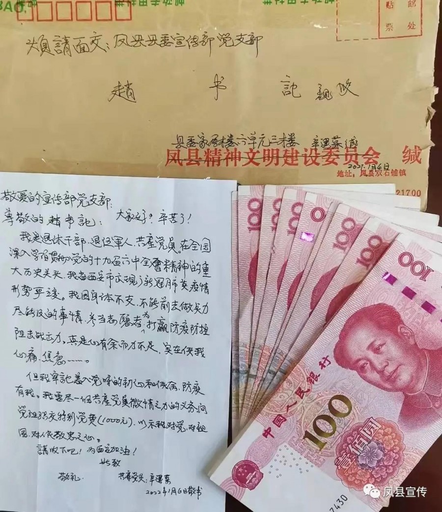 “西安市疫情爆发以来,我时刻关注疫情形势,因自己身体不支,不能前去当志愿者,想着做点自己力所能及的事……”1月12日,凤县县委宣传部党支部书记赵正卿收到的一封亲笔信和一笔1000元的特殊党费。