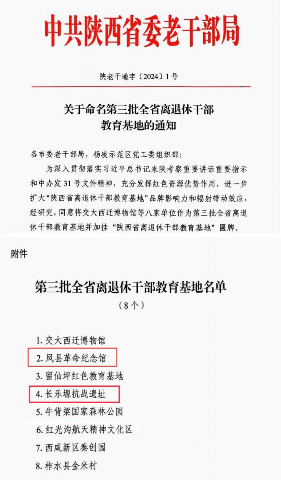 近日,省委老干部局公布了第三批全省离退休干部教育基地名单,全省共有八家单位被命名为“陕西省离退休干部教育基地”,其中,我市长乐塬抗战遗址、凤县革命纪念馆榜上有名。