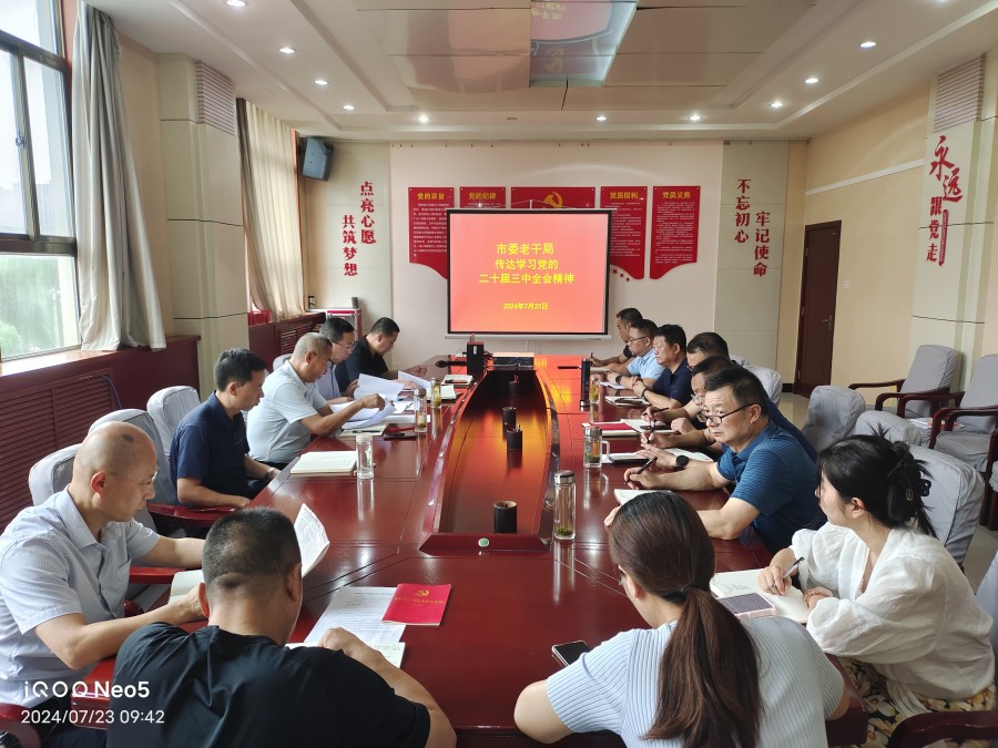 7月23日,市委老干局召开专题会议,传达学习贯彻党的二十届三中全会精神。会议传达学习了习近平总书记在党的二十届三中全会上的重要讲话精神、《中共中央关于进一步全面深化改革、推进中国式现代化的决定》,研究贯彻落实工作。