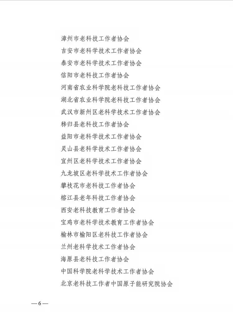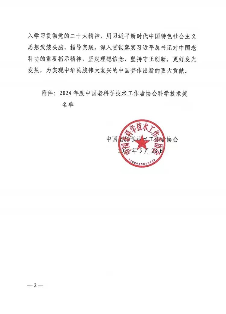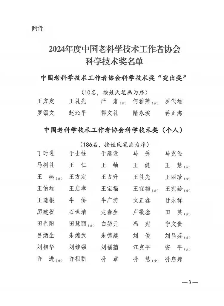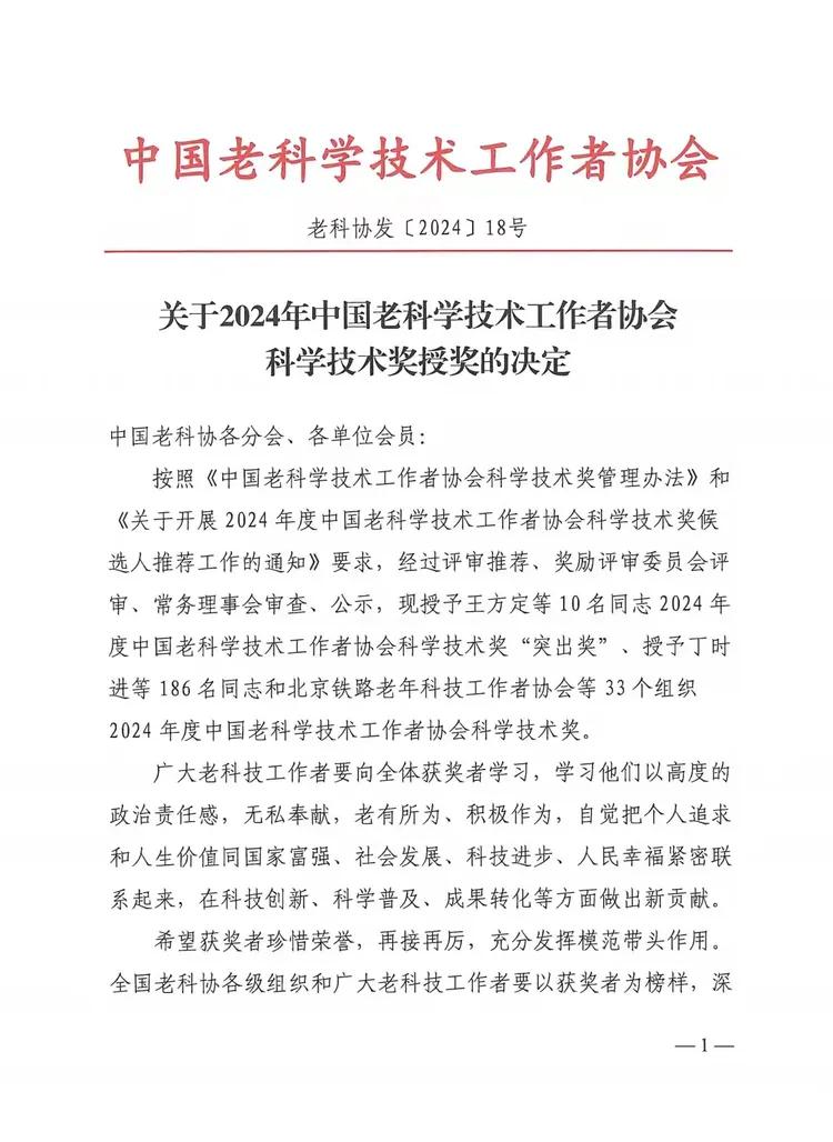 近日,中国老科协印发《关于2024年中国老科学技术工作者协会科学技术奖授奖的决定》(老科协发〔2024〕18号),授予王方定等10名同志2024年度中国老科学技术工作者协会科学技术奖“突出奖”、授予丁时进等186名同志和北京铁路老年科技工作者协会等33个组织2024年度中国老科学技术工作者协会“科学技术奖”。宝鸡市老科协榜上有名受到表彰,这是市老科协首次荣获中国老科协“科学技术奖”殊荣。