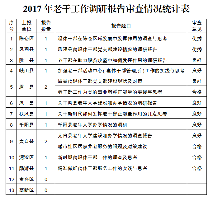 根据省委老干局《关于评选2017年度优秀调研报告的通知》要求,我局对2017年度调研报告进行了认真评审(审查情况见下表)。截止3月27日,共收到各县区2017年调研报告13篇,经过多轮评选后,上报省局7篇。综合整体情况来看,大部分县区都能按要求组织撰写,及时上报,部分调研报告质量较高,但仍有个别单位对此项工作认识不到位,重视不够,不能及时按要求上报。就调研报告的质量来看,多数报告格式不规范,没有按照“有现状、有问题、有分析、有对策”的格式要求撰写,有的把调研报告写成了经验交流材料,有的报告没有结合实际查找问题,分析不深入,对策建议不细不实,可操作性不强。希望各县区能够高度重视,认真安排部署,并于7月份之前高质量完成2018年调研工作。