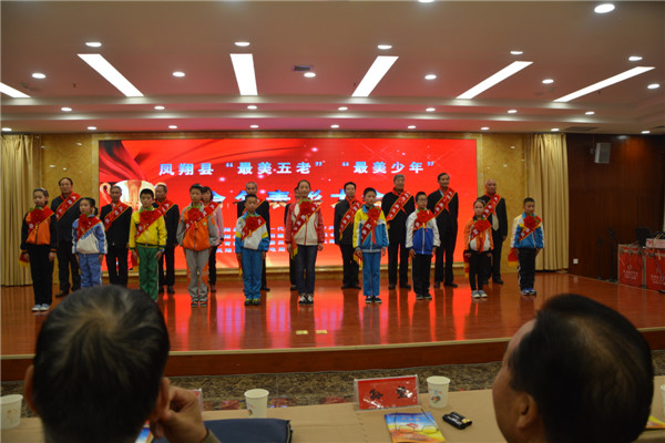 为深入贯彻习近平总书记对关心下一代工作的重要指示精神。近期,凤翔县隆重召开“最美五老”“最美少年”命名表彰大会。省市县各级关工委领导和负责同志以及学生代表、家长共300多人参加了会议。会议对2016在全县评选出来的10名“最美五老”,10名“最美少年”进行了命名表彰,“最美五老”和“最美少年”相互佩戴了红领巾和大红花,颁奖嘉宾为他们颁发了奖杯。会议气氛热烈,受奖的“五老”和“少年”以及与会人员深受鼓舞。此次活动旨在凝聚和传递“大手拉小手共筑中国梦”的爱心力量,进一步做好关爱未成年人工作。
