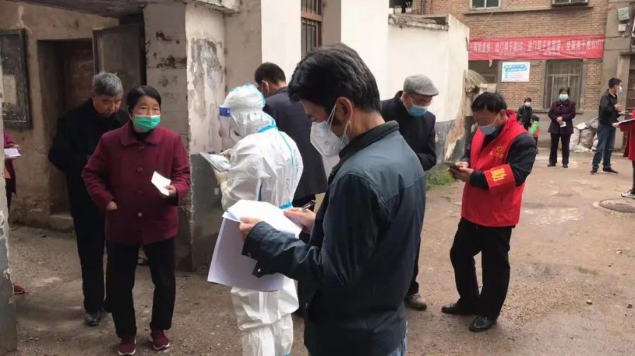 “居民同志们下楼做核酸检测了!”3月17日是陇县城区居民第三轮大规模做核酸的日子,这是县供销联社离退休干部党支部书记张有宁在供销联社家属院配合县疫情防控指挥部拿着小喇叭喊居民做核酸检测的情景。