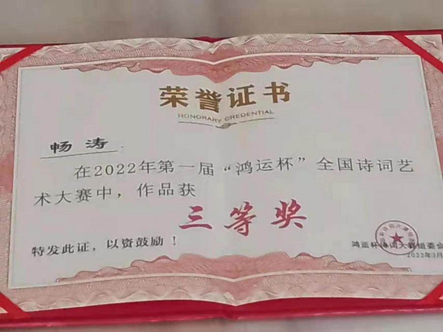 近日,陇县财政局离退休干部党支部党员、局原党组书记畅涛的《赞人民英雄》等五首诗词作品荣获2022年第一届“鸿运杯”全国诗词艺术大赛三等奖。