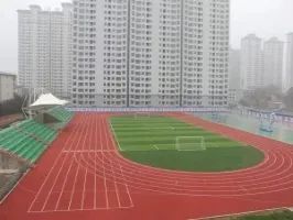 新校门右侧是占地11000平方米的运动场。红绿相间的人工塑胶垫覆盖了全部操场地面。造型科学、新颖别致的钢管篮球架子上的钢化玻璃取代了昔日的木质篮板。操场的东边坐东朝西是检阅台和观赏台,其后面的"培养阳光少年,奠基幸福人生"的大幅标语,彰显了学校旨在促进学生德智体全面发展的办学目标。