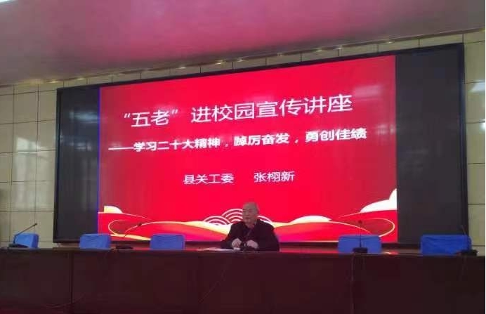 在陇县中学,“银发宣讲团”成员张栩新以《学习党的二十大精神,踔厉奋发,勇创佳绩》为题给学生进行了党的二十大精神宣讲。他结合自身多年工作,讲述了中国式现代化的五大特征、实现中国式现代化的本质要求和推进中国式现代化的原则,并给孩子们提出了希望和要求。500余名学生认真倾听,一致认为老干部思维敏捷,语言简练、亲切,就像自己的爷爷在谆谆教诲。孩子们纷纷表示,要克服困难,勇于拼搏,踔厉奋发,勇创佳绩,听党话跟党走,努力做中国式现代化建设事业的接班人。